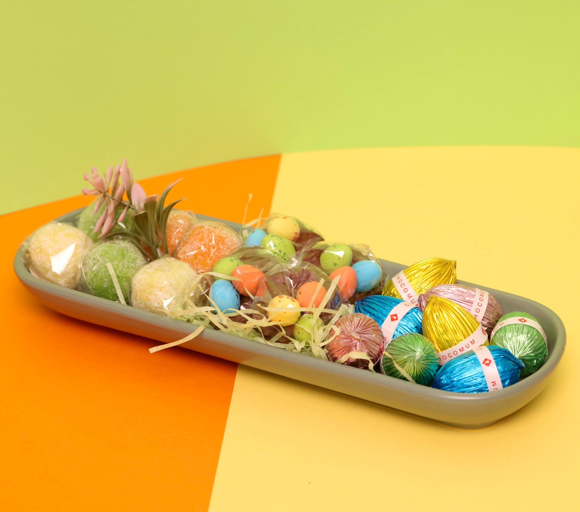 This elegant ceramic tray comes filled with a delightful assortment of our finest Easter-themed pieces, from our delicious choco-eggs and choco-nests (all milk chocolate) to our marzipan selection.
